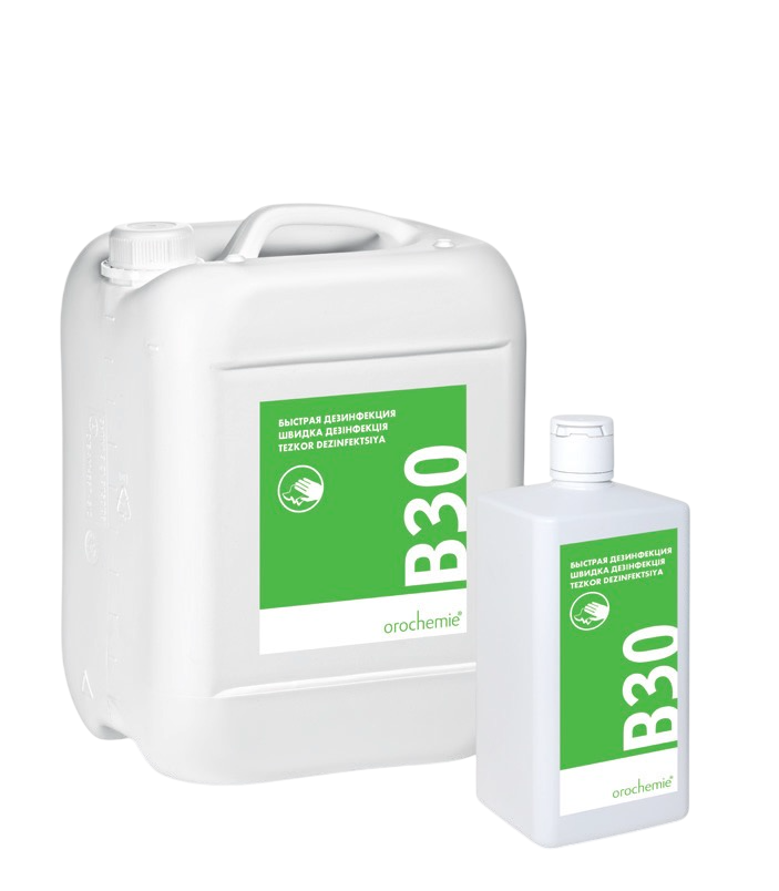 B 30 suvli eritmadagi spirtlar, to‘rtlamchi ammoniy birikmalar va yordamchi moddalarni o‘z ichiga oladi. 100 g. tarkibida 62 g etanol, 0,05 g. didecil dimetil ammoniy xlorid bor.