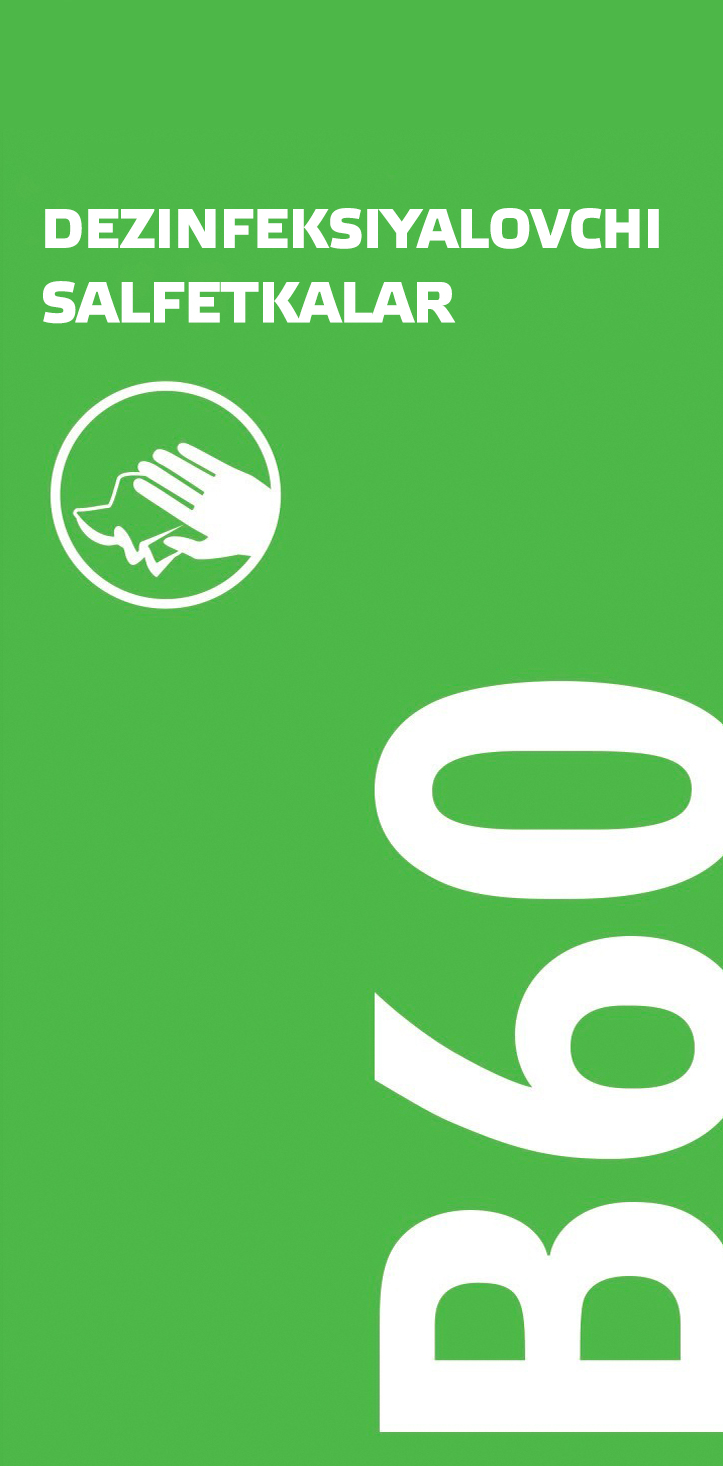 B 60 dezinfeksiyalovchi salfetkalari tayyor, tarkibida spirt bo‘lgan dezinfeksiyalovchi salfetkalardir. Ular noinvaziv tibbiy mahsulotlar, qurilmalar, tibbiy uskunalar va hokazolarning yuzalarini bir vaqtda dezinfeksiya qilish va artib tozalash uchun alohida qulay bo‘lib, klinikalarning barcha sohalarida, masalan, jarrohlik xonalari, jadal terapiya palatalari, ambulatoriya bo‘limlari, markaziy sterilizatsiya xonalari, jarrohlik paytida ishlatiladigan diagnostika asboblari, tez tibbiy yordam bo‘limlari, qariyalar uylari, oziq-ovqat sanoati va mukammal gigiyenik holat talab qilinadigan boshqa sohalarda ishlatiladi.